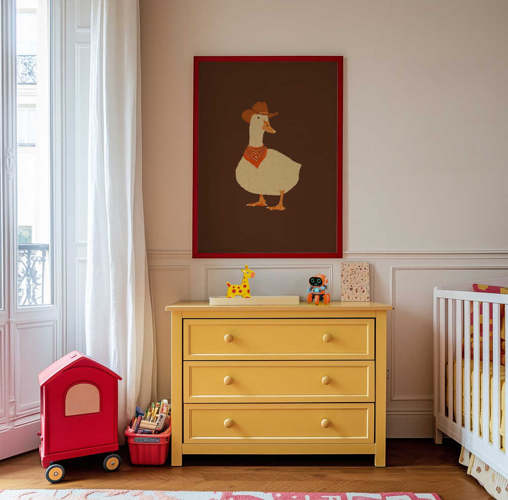 Ge din inredning en lekfull och charmig touch med denna härliga väggkonst som visar Bo the Cowboy Duck, klädd i varma jordnära toner med sin karakteristiska hatt och bandana mot en rik brun bakgrund. Den minimalistiska kompositionen och den harmoniska färgpaletten skapar en lugn och balanserad atmosfär utan att ta över rummet.